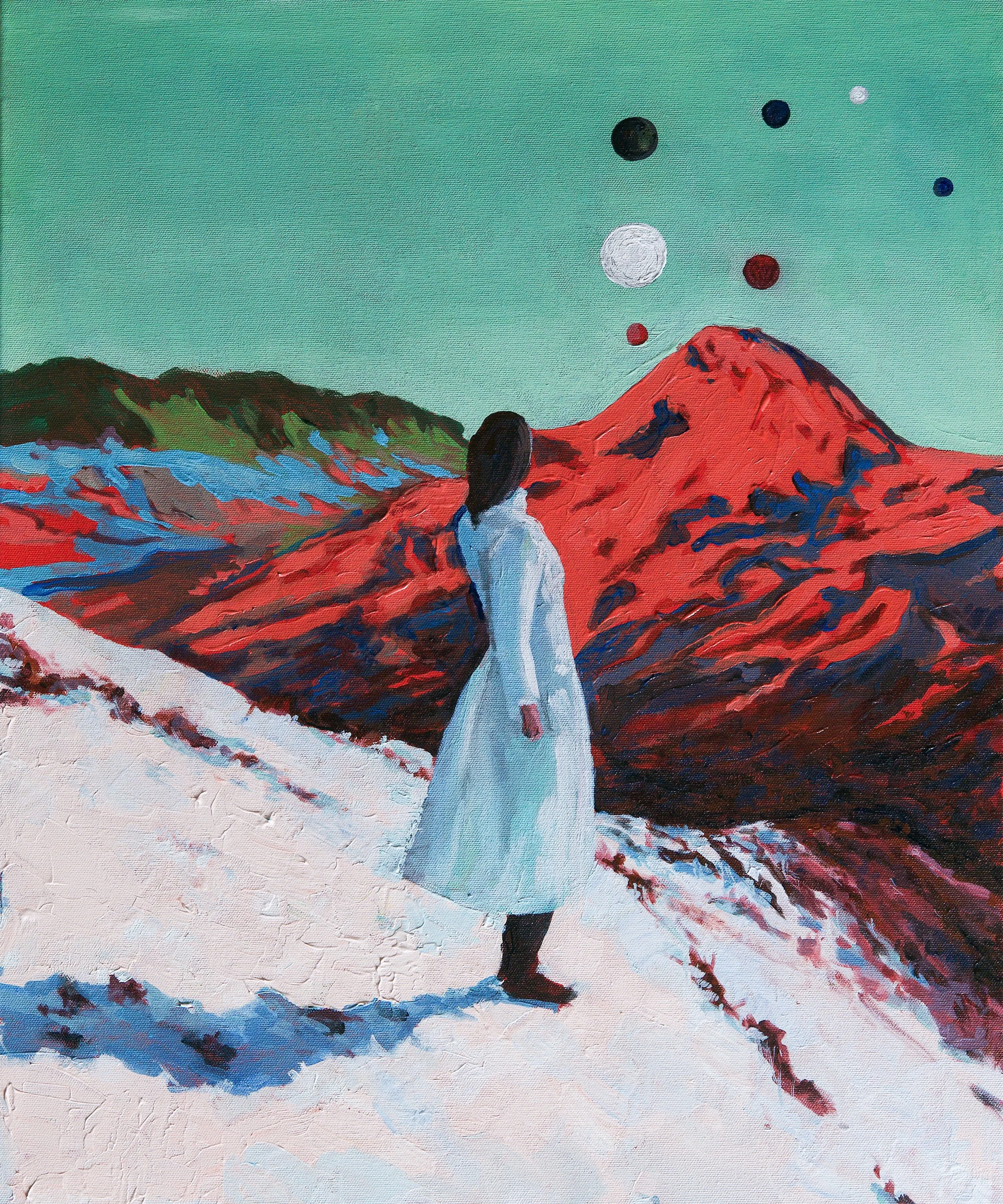 "The Alley of Many Suns" is a surreal landscape born from quiet tension, that feeling that life branches in many directions, and you’re just trying to feel which sun is yours. The artist balances expressionist color with a pared-down surreal structure, letting the atmosphere do the talking.