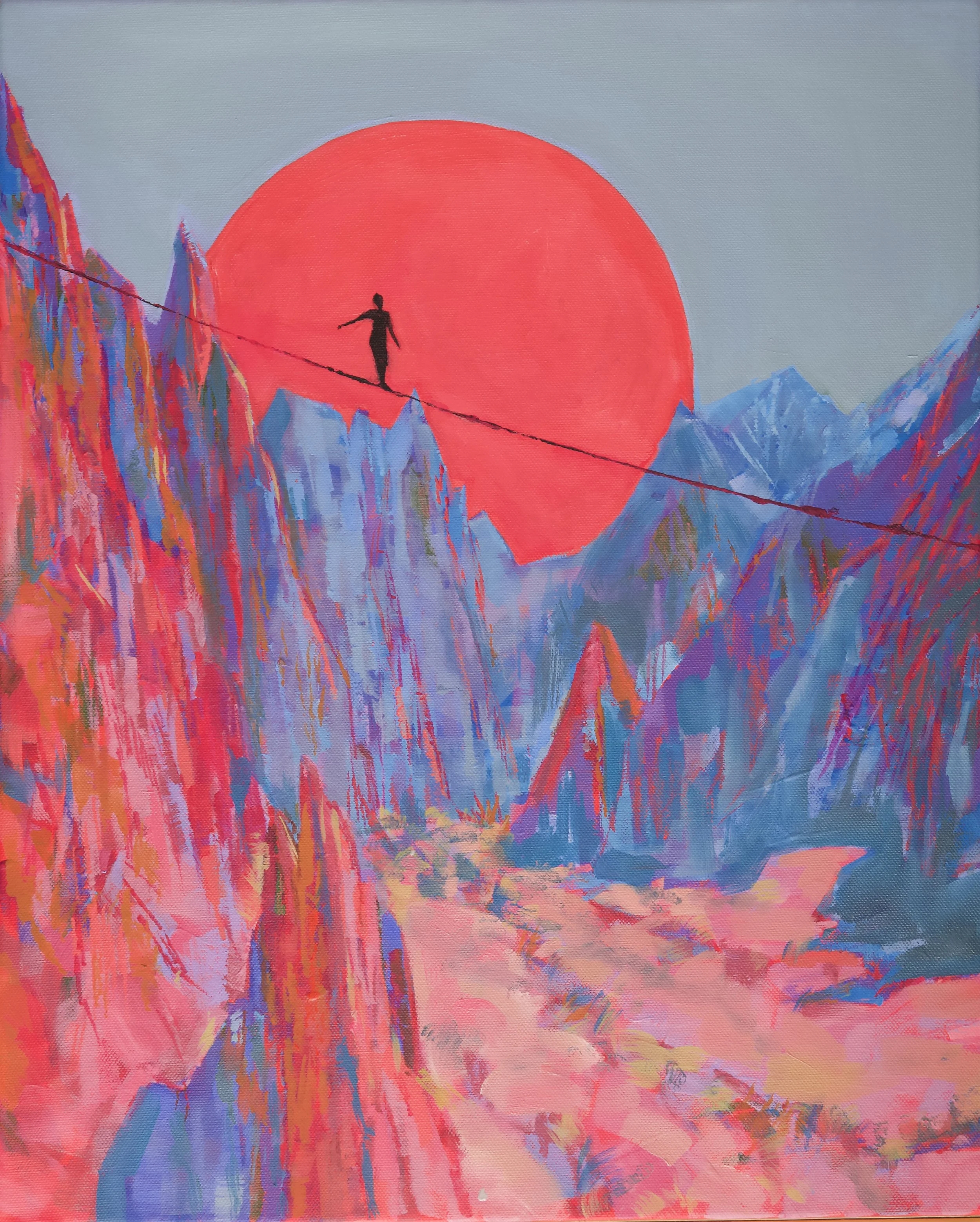 "The Promenade" invites you into a captivating world where a lone figure navigates a delicate path between the grounding earth and the boundless sky. This original acrylic painting on canvas masterfully blends impressionistic brushwork with surreal dreamscape elements, creating a powerful emotional resonance. The oversized sun and subtly shifting terrain play with scale, creating a dreamlike tension that balances movement and profound stillness.